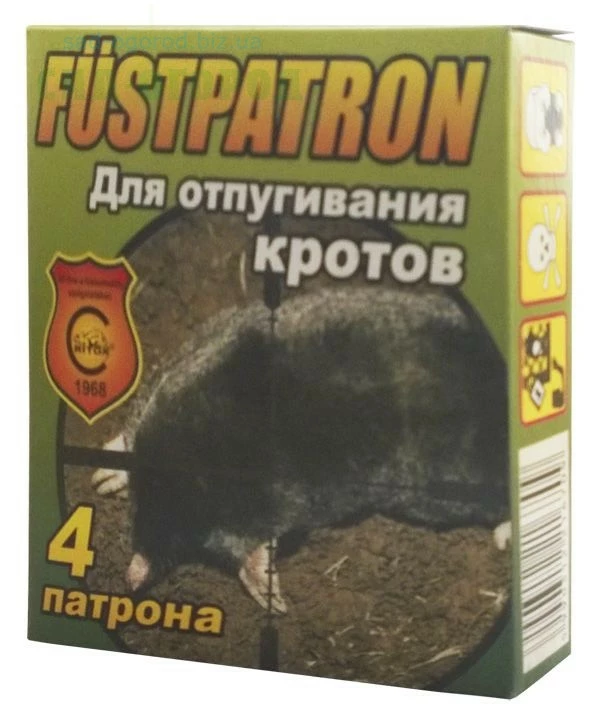 Фюштпатрон, патрони від крота 4 шт - потужний засіб для боротьби з кротами та ін. мишоподібними гризунами і ховрахами в приватних господарствах.Кроти завдають серйозної шкоди садових і дачних газонах, володіючи дивовижною продуктивністю і високою плодючістю, здатні в короткий час зруйнувати весь ваш город, сад. Хоча кроти – хижаки і не гризуть коріння рослин безпосередньо, шкоди рослинам від них відчутний. Оголені корені як правило відмирають, і дерево гине, або занепадає. Що вже говорити про дрібних рослини на городі. Кріт на грядці – це загибель урожаю.