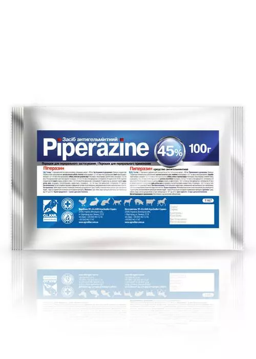 Піперазину цитрат - сіль піперазину, яка діє згубно на личинкові і дорослі форми гельмінтів. Мала токсичність на організм тварин і птиці дозволяє згодовувати препарат групі тварин з кормом для дегельмінтизації.