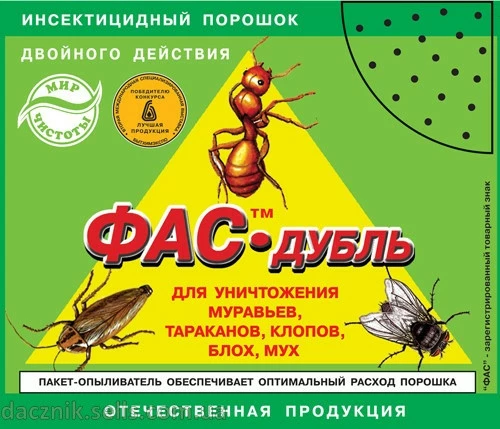 ФАС-дубль (125 гр) - засіб для знищення тарганів, мурашок, клопів, бліх, мух професійним контингентом в практиці медичної дезінсекції та населенням в побуті на об'єктах різної категорії. Речовина - дуст від світло-сірого до світло-коричневого кольору, що містить в якості діючої речовини зета-циперметрин та ес-фенвалерат.Переваги: