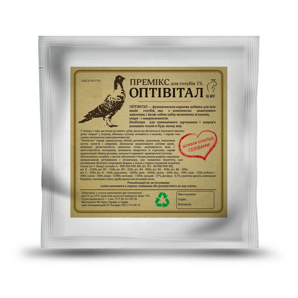 Премікс «Оптивитал» для голубів — функціональна кормова добавка для голубів всіх видів, що є комплексом додаткового живлення. Він являє собою набір незамінних вітамінів, мікро - і макроелементів, необхідних для повноцінного харчування та гарного здоров'я птахів в будь-якому віці.Переваги