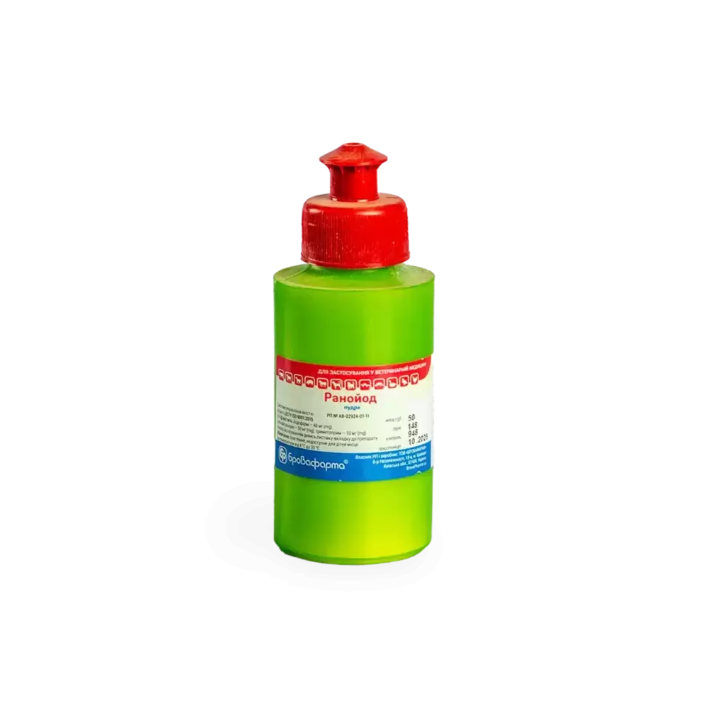 Опис Порошок жовтуватого кольору. Склад 1 г препарату містить діючі речовини: йодоформ - 40 мг; сульфагуанідин - 50 мг; триметоприм -10 мг; Допоміжні речовини: тальк, кліноптіоліт. Фармакологічні властивості Йодоформ під дією світла, повітря, тканинних ферментів, мікроорганізмів розпадається з виділенням молекулярного йоду. Йод має протимікробну, репелентну, дезодоруючу, розсмоктуючу дію, сприяє грануляції та очищенню рани. На поверхні рани утворюються альбумінати йоду, в результаті проявляється в’яжуча та анестезуюча дія, зникає подразнення рецепторів. Синергічна комбінація сульфаніламіду з триметопримом додатково забезпечує тривалу протимікробну дію. Сульфагуанідин - сульфаніламідний препарат широкого спектра дії. Він діє бактеріостатично проти грампозитивних і грамнегативних бактерій (Actinomyces spp., E.coli, Clostridium spp., Salmonella spp., Proteus spp., Bacillus anthracis, Pasteurella spp., Haemophilus spp., Erysipelothrix rhusiopathiae, Actinobacillus spp., Fusobacterium spp., Haemophilus spp., Moraxella spp., Vibrio spp., Staphylococcus spp., Streptococcus spp., Shigella spp., Corynebacterium spp., Klebsiella spp., Fusobacterium spp., Bordetella spp., Brucella spp., a також на мікоплазми (Mycoplasma spp.). Механізм дії пов’язаний з ПАБК та конкурентним пригніченням дигідроптероатсинтетази, що призводить до порушення синтезу тетрагідрофолієвої кислоти, необхідної для синтезу пуринів та піримідинів. Триметоприм - хіміотерапевтичний препарат, що володіє бактеріостатичною дією проти грампозитивних та грамнегативних мікроорганізмів (E.coli, Enterobacter spp., Proteus spp., Klebsiella spp.). Він інгібує бактеріальну редуктазу, яка перетворює дегідрофолієву кислоту в тетрагідрофолієву, яка є необхідною для синтезу пуринів і піримідинів. Наповнювач має в своєму складі велику кількість солей алюмінію та силікатів, що створюють підсушуючий ефект, сприяють зменшенню ексудації і прискоренню регенерації ушкоджених тканин, і відповідно, прискорюють загоювання ран. Застосування Лікування коней, великої рогатої худоби, овець, кіз, свиней, собак, котів, песців, норок та свійської птиці (кури, гуси, качки) хворих на фолікуліт, дерматит, екзему, а також при інфікованих ранах, мокрих екземах, трофічних виразках, важко загоюваних ранах, запаленнях зовнішнього слухового проходу, попрілості складок шкіри, після вскриття гематом, абсцесів, фібром, фурункулів, флегмон, застосовують також профілактично після операційних втручань (кастрація, видалення пухлин, декорнуація тощо), що спричинені мікроорганізмами чутливими до сульфагуанідину, триметоприму та йодоформу. Дозування Зовнішньо. Припудрюють попередньо очищені уражені ділянки шкіри і 2-3 см навколо них та накладають пов’язку. Обробку проводять 1 раз на добу до повного видужання. Протипокази Не застосовувати тваринам з підвищеною чутливістю до діючих речовин препарату. Препарат не сумісний з аміаком, окислювачами та кислотами. Застереження Тільки для зовнішнього застосування. Уникати потрапляння в очі та слизові оболонки. Під час роботи з препаратом забороняється палити, пити та приймати їжу. Після закінчення обробки слід ретельно вимити руки теплою водою з милом. Форма випуску Поліпропіленові флакони з пудро-розпилювальною насадкою по 35, 50 та 100 г, тріплексні пакети або контейнери з полімерних матеріалів по 100, 200 та 500 г, 1 кг. Зберігання Сухе, темне, недоступне для дітей місце при температурі від 4° до 30°С.Термін придатності - 3 роки. Для застосування у ветеринарній медицині!