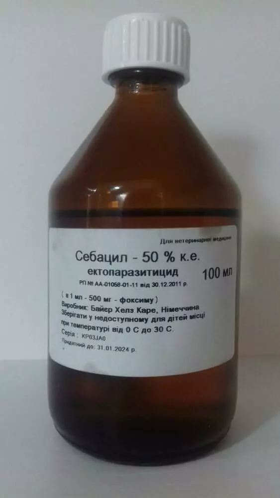 Для знищення коростяних кліщів (Psoroptes, Sarcoptes, Chorioptes), кусають і сисних вошей, рунцов овечих, бліх, а також личинок м'ясної мухи. Себаціл® 50% характеризується високою акарицидной та інсектицидної ефективністю одночасно з низькою токсичністю для ссавців. ВРХ (нелактуючі), вівці, свині.