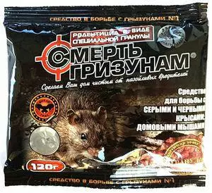 Смерть гризунів гранули - засіб родентицидний у вигляді гранульованої приманки з привлекателем для знищення щурів і мишоподібних гризунів у житлових та не житлових приміщеннях, а також на сільськогосподарських угіддях і на присадибних ділянках.Склад: крупа екструдована (гранула), заманник, гіркоту, барвник, допоміжні речовини, діюча речовина - бродіфакум (0,005)%.