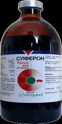 СкладДекстран заліза - 7 мг,міді (II) хлорид - 27,1 мкг,кобальту (II) хлорид - 2,66 мкг,тіаміну (вітамін В1) - 30 мкг,рибофлавіну (вітамін В2) - 11,4 мкг ,піридоксину (вітамін В6) – 2,8 мкг, ніацину (вітамін В5) – 428,4 мкг, кальцію пантотенат (вітамін В3) – 16 мкг, інактивована сіроватка крові свиней – до 1 мл.