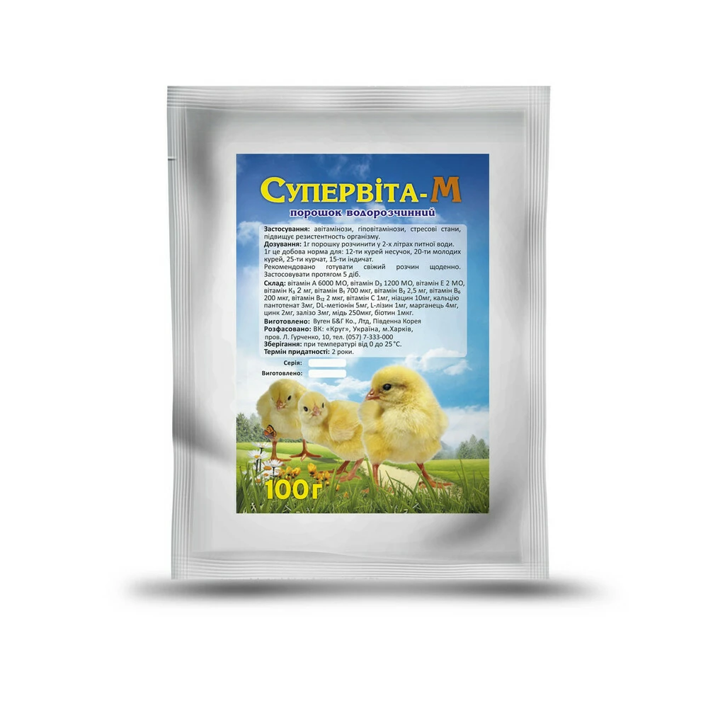 СкладВітамін А — 6000 МО, вітамін D3 — 1200 МО, вітамін Е — 2 МО, вітамін К3 — 2 мг, вітамін В1 — 700 мкг, вітамін В2 — 2,5 мг, вітамін В6 — 200 мкг, вітамін В12 — 2 мкг, вітамін С — 1 мг, ніацин — 10 мг, кальцію пантотенат — 3 мг, DL-метіонін — 5 мг, L-лізин — 1 мг, марганець — 4 мг, цинку — 2 мг, залізо — 3 мг, мідь — 250мкг, біотин — 1 мкг.
