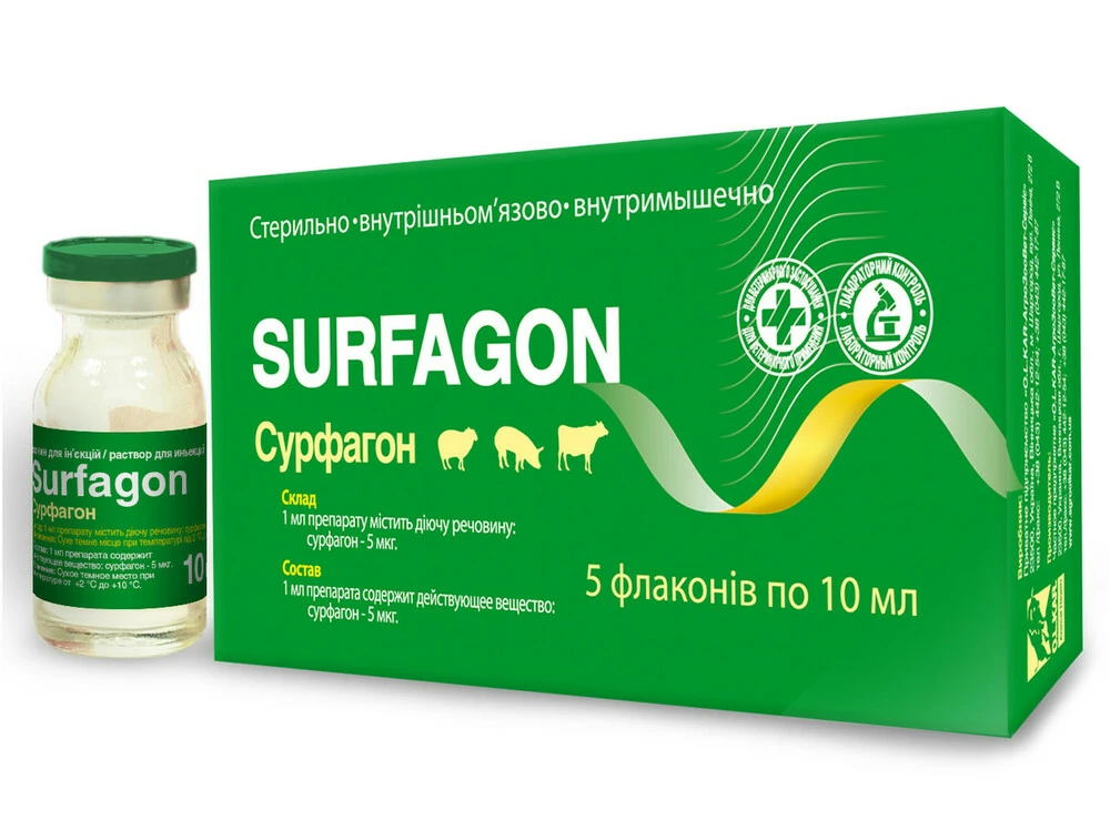 Для повышения оплодотворяемости свиноматок через 24-48 часов после отъема поросят, животным вводят 100 МЕ СЖК или ГСЖК и через 56 часов Сурфагон в дозе 50 мкг. Осеменения свиноматок проводят в соответствии с инструкцией.