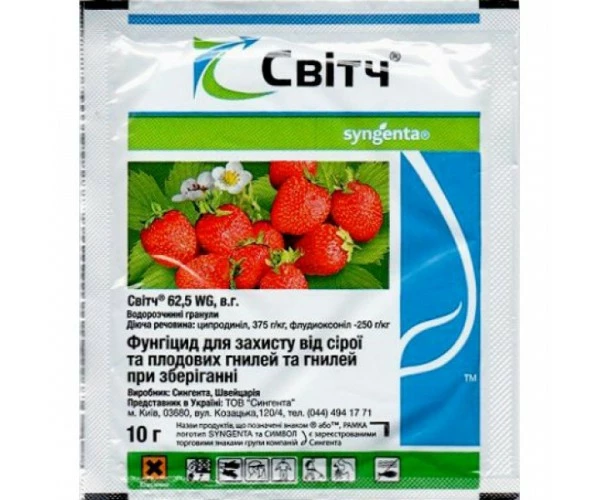 Світч 62,5 WG в. р. — Препарат містить дві діючі речовини — флудиоксоніл і ципродиніл, які забезпечують подвійний вплив на збудника хвороби та надійний захист рослини. Світч 62,5 WG в. р. має контактно-проникаючу і профілактично-викорінювальну дію, тому захищає рослину на чотирьох етапах розвитку збудника хвороби: при проростанні конідій, на початку росту міцелію патогена, при проникненні патогена в клітину, а також він зупиняє ріст міцелію в клітині. Використання препарату Світч 62,5 WG в. р. істотно покращує якість плодів при зберіганні і транспортуванні. У країнах Західної Європи Світч 62,5 WG в. р. застосовують на капусті, спаржевій квасолі, малині й інших ягідниках. Лікувальна дія — 2 доби, захисна — 10-12 днів. Безпечний для бджіл, корисних комах і довкілля. Малотоксичний, безпечний для людей (ЛД50>3000 мг/кг).