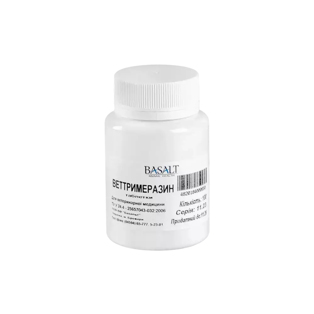 Опис:таблетка округлої пласкої форми від білого до світло-жовтого кольору. Склад: до складу однієї таблетки входять: сульфадимезин (400 мг), триметоприм (80 мг), формоутворюючі речовини. Фармакологічні властивості: комбінована дія складових препарату призводить до гальмування росту і розвитку мікробної клітини. Препарат має широкий спектр антимікробної дії та ефективний по відношенню до грампозитивних та грамнегативних мікроорганізмів: Salmonella, Е. соli, Staphylococcus, Pasteurella spp., Streptococcus, Mycoplasma та інші. Показання та дозування: Лікування захворювань шлунково-кишкового тракту, органів дихання, сечостатевої системи бактеріальної етіології, ускладнень при вірусних захворюваннях у телят, поросят, ягнят, лошат, овець і свиней. Задають перорально з водою чи молоком або з кормом в дозі ½ таблетки двічі – через кожні 12 годин. Лікування продовжують до повного зникнення симптомів захворювання і наступні 2 дні. Протипоказання: підвищена чутливість до сульфаніламідів. Не застосовувати одночасно з препаратами, що містять у своєму складі параамінобензойну кислоту. Застереження: забій тварин на м'ясо дозволяється не раніше ніж через 15 діб після останнього застосування препарату. До зазначеного терміну м'ясо згодовують непродуктивним тваринам або утилізують (залежно від висновку ветлікаря). Форма випуску: полімерні банки по 50, 100, 300 шт. Умови зберігання: у сухому темному місці при температурі від 0°С до +18°С. Термін придатності: 3 роки.