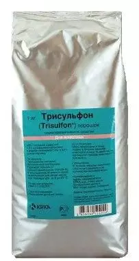 Опис:Трисульфон (Trisulfon) - комбінований хіміотерапевтичний препарат з широким антимікробним спектром дії, який містить в якості діючих речовин 40 мг/г сульфамонометоксину натрію та 20 мг/г триметоприму. Зовнішній вид - білий сипучий порошок без запаху, добре розчинний у воді.
