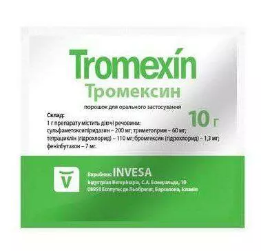 Тромексин уп. 10г. Іспанія InvesaТромексин – комплексний антибактеріальний препарат, в 1 грамі якого міститься в якості діючих речовин – 200 мг сульфаметоксипиридазина, 40 мг триметоприму, 110 мг тетрацикліну хлоргідрату, 0,13 мг бромгексину хлоргідрату. За зовнішнім виглядом являє собою порошок світло-жовтого кольору. Випускають у фольгованих пакетах по 0,5 кг і 1 кг, упакованих в картонні коробки по 20 штук та 10 штук відповідно.