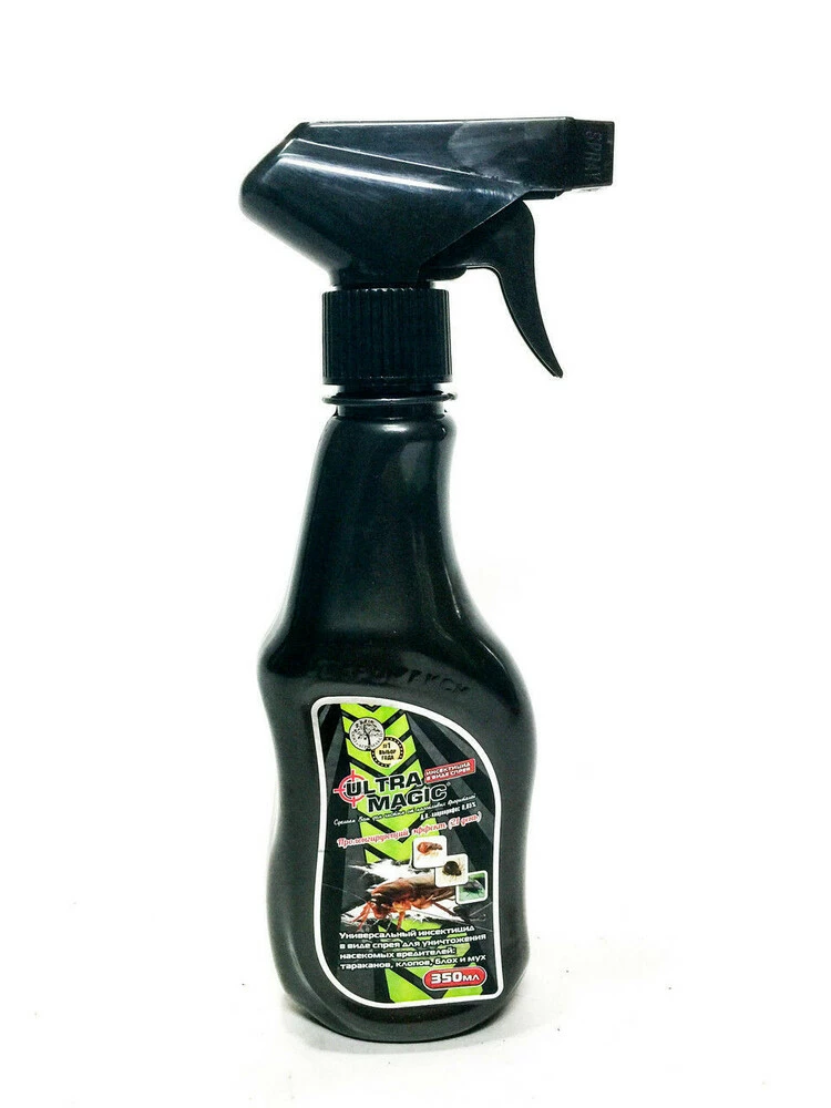 «Ультра-магік» - найбільш ефективне універсальне засіб для знищення будь-яких літаючих та повзаючих комах з подвійним дією; готове до побутового і комунального використання засіб, що забезпечує миттєве дію і тривалий залишковий ефект (21день).Засіб «Ультра-магік» не містить шкідливі для навколишнього середовища озоноруйнівні речовини. Склад: діюча речовина: імідаклоприд - 1,5%, ПЕГ 400, заманник, водний концентрат, ефірні масла. Використовувати тільки для обробки поверхонь.