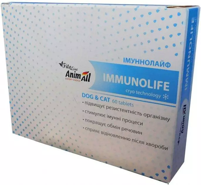 Імунолайф надає стимуляційної дії на центральну нервову систему, підвищує адаптаційні властивості та резистентність організму до дії шкідливих чинників довкілля. Покращує захисні сили організму, підвищує рівень гемоглобіну в крові, а також покращує обмін речовин. Покращує апетит і травлення. Допомагає тварині відновити сили в разі підвищеної втомлюваності, тонізує організм і забезпечує потрібними нутрієнтами, підвищує захисні властивості всіх органів і систем.