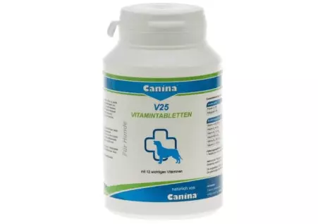 Для того щоб забезпечити організм усіма необхідними вітамінами і доповнити раціон тварини важливими амінокислотами спеціально був розроблений продукт V25, що містить комплекс з 12 основних вітамінів і найважливіших амінокислот. V25 сприяє здоровому зростанню та правильному розвитку всіх систем організму цуценят та молодих собак, стимулює білковий та жировий обмін, сприяє якісному та правильному процесу кровотворення.Склад