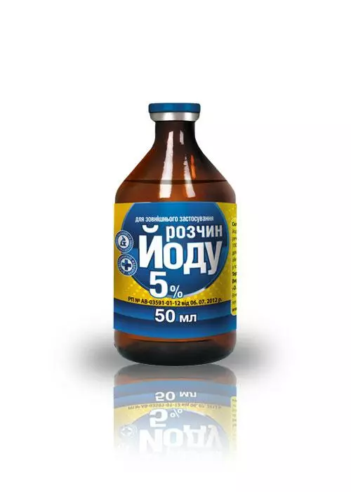 100 мл препарату містить діючі речовини (г): йод кристалічний - 5; калію йодид - 2.