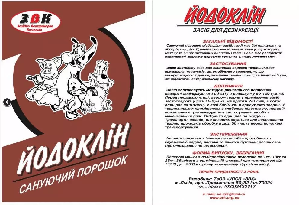 Дезінфікуючий засіб “Йодоклін®”«Йодоклін®» – препарат для сухої дезінфекції на основі йодоформу, який застосовують для дезінфекції та санітарної обробки тваринницьких приміщень.