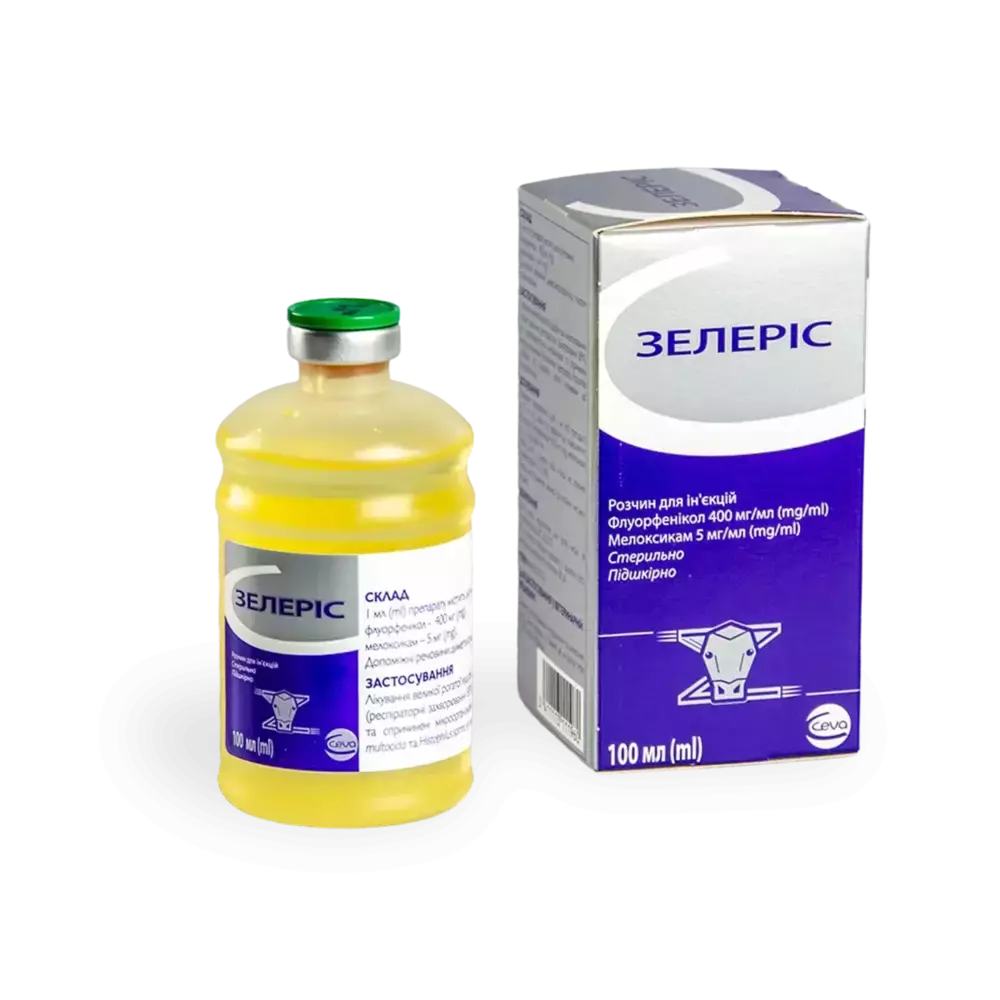 Діючі речовини: флорфенікол і мелоксикам. Фармакологічні властивості Зелеріс є комбінований препарат, що містить синтетичне протимікробний засіб широкого спектру дії флорфенікол і нестероїдні протизапальні засоби (НПЗЗ) групи оксикамов мелоксикам. Флорфенікол, що входить до складу лікарського препарату, має широкий спектр антибактеріальної дії щодо грампозитивних і грамнегативних бактерій, в тому числі основних збудників інфекційних хвороб респіраторного тракту тварин: Pasteurella multocida, Histophilus somni, Mannheimia haemolytica. Мелоксикам, що входить до складу препарату, має протизапальну, протиексудативну, знеболювальну та жарознижувальну дію. Показання Зелеріс застосовують великій рогатій худобі при респіраторних та інших захворюваннях, викликаних чутливими до флорфеніколу мікроорганізмами. Спосіб застосування та Дозування Застосовують одноразово підшкірно в дозі 1 мл / 10 кг маси тварини, що відповідає дозі флорфенікола 40 мг / кг і мелоксикаму 0,5 мг / кг. Максимальний обсяг для введення в одне місце не повинен перевищувати 15 мл. ОСОБЛИВІ ВКАЗІВКИ Протипоказанням до застосування препарату є індивідуальна підвищена чутливість тварини до складових компонентів. Забороняється застосовувати зелеріс бикам-виробникам, а також тваринам при недостатності функції печінки, нирок і серця, геморагічних порушеннях, виразках шлунково-кишкового тракту. Не рекомендується застосовувати одночасно з тіамфенікол і хлорамфеніколом, бактерицидними антибіотиками, з іншими нестероїдними протизапальними, глюкокортикоїдними і потенційно нефротоксичними лікарськими засобами, а також з антикоагулянтами. Не змішувати в одному шприці з іншими лікарськими препаратами. Препарат заборонений до застосування продуктивним тваринам, чиє молоко використовується в їжу людям. Термін придатності І Зберігати Термін придатності препарату при дотриманні умов зберігання в закритій упаковці - 3 роки з дня виробництва, після відкриття флакона - не більше 28 днів. Забороняється використовувати препарат після закінчення терміну його придатності. Зберігають зелеріс в закритій упаковці виробника, окремо від продуктів харчування і кормів, в сухому, захищеному від прямих сонячних променів місці, при температурі від плюс 2 ºС до плюс 25 ºС. З більш детальною інформацією про препарат Ви можете ознайомитись в інструкції, що додається.Оплата та доставка