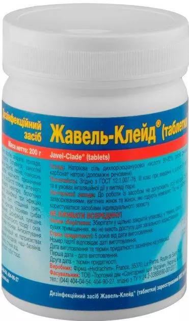 дезінфікуючий засіб «Жавель-Клейд» випускають у вигляді таблеток білого кольору масою 3,45 - 3,65 г, які добре розчиняються у воді. При розчиненні однієї таблетки у питній воді виділяється 1,47 - 1,62 р (44%) активного хлору. Водні розчини засобу прозорі, безбарвні, мають легкий запах хлору, не пошкоджують об'єкти з корозійностійких металів, скла, гуми, полімерних матеріалів, дерева, кахлю, поверхні пристроїв з гальванічним, лакофарбовим та полімерним покриттям, не фіксує білкові забруднення на поверхнях виробів. добре змиваються, не залишають нальоту, гомогенізують мокротиння та інші виділення. Засіб «Жавель-Клейд» не горить, вибухобезпечний, сумісний з милами, сульфованими маслами, аніонними ПАР, амфотерними та неіоногенними речовинами, солями лужних металів неорганічних та органічних кислот.