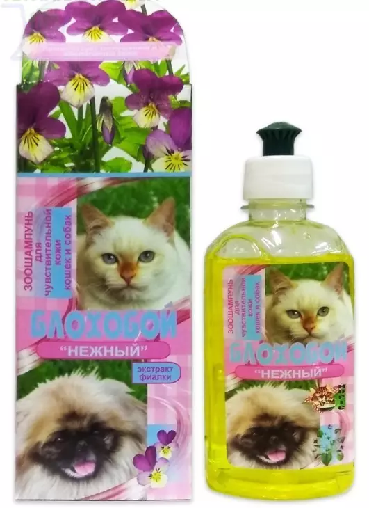 Шампунь БЛОХОБИЙ Ніжний з екстрактом фіалки, 200 мл - інсектицидний шампунь для чутливої шкіри проти бліх та кліщів у собак та котів. Знімає подразнення шкіри, спричинене присутністю ектопаразитів. Завдяки підбору компонентів діє ніжно на шкіру, що дозволяє використовувати шампунь для тварин із чутливою шкірою. Екстракт фіалки, який входить до складу цього шампуню, дбайливо і м'яко доглядає вовну, знімає алергічні запалення, перешкоджає появі нових почервонінь і лущення, впадання вовни. Має зволожуючу та живильну дію на шкіру. Рекомендований для тварин, схильних до алергічних реакцій коштом догляду.склад: екстракт фіалки, входять: генапол, генаген, NaCl, катон, барвник, піретроїди.